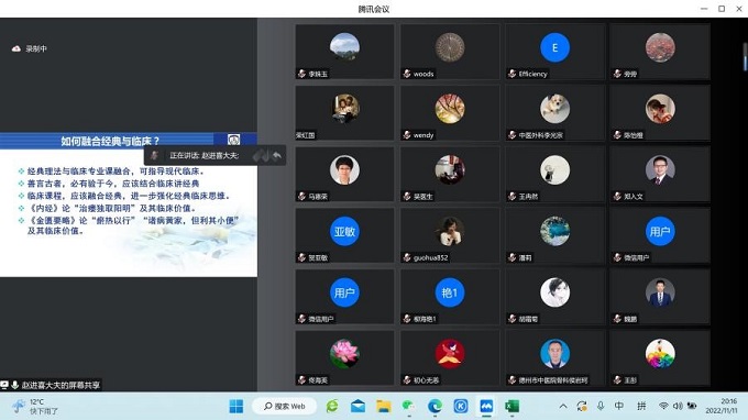 2022年11月11日星期五下午19点半,yl23411永利邀请到永利官网第一临床医学院中医内科教研室主任赵进喜教授做题为“经典与临床融合,教书与育人并重”的线上讲座。此次讲座线上共吸引了200余名教师在线聆听,讲座由yl23411永利费宇彤副经理主持。